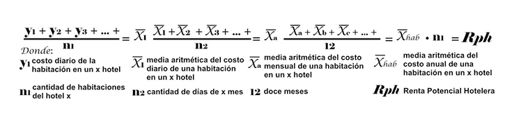 Uno de los indicadores más importantes que utilizamos es lo que entendemos como renta potencial hotelera (Rph) que se obtuvo como resultado del seguimiento de la tarifa diaria de las habitaciones en base doble (diferenciadas por categoría7) de cada hotel relevado durante el año 2019. Este relevamiento permitió calcular la media aritmética por día8. Con este valor, se calculó la media por cada mes, y a partir de este dato se obtuvo la media aritmética de los doce meses que, finalmente, se multiplicó por el número de habitaciones y así obtener la Rph por complejo hotelero9 (Fig. 1). Complementariamente, se calculó la plusvalía hotelera tomando como valor de referencia el salario (en dólares) básico e inicial de un trabajador del sector de limpieza para estimar la participación de sus ingresos en la Rph mensual de una habitación de hotel (calculada en base a los complejos relevados) del país o territorio en el que se desempeña.