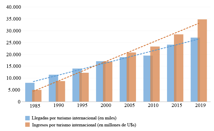 La selección del caso de estudio se justifica por dos motivos. Por un lado, en las últimas cuatro décadas, los países y territorios insulares de la región Caribe10 han reordenado sus economías y redefinido territorios en función del turismo. En varios casos, sobre todo en la mayoría de las Antillas Menores, el turismo ha desplazado a las actividades primarias tradicionales (heredadas de la economía de plantación) como fuentes principales de ingresos en las cuentas nacionales. Prueba de esto último, es el crecimiento constante de los principales indicadores turísticos (Fig. 2). Según datos de la Organización Mundial del Turismo (OMT, 1994), en 1985 los arribos por turismo internacional en el Caribe eran de 7.976.000 y una década después se duplicaron (OMT, 2000). Para el 2010, las llegadas se aproximaron a 20 millones de arribos anuales (OMT, 2014); mientras que en el 2019 (último año no afectado por la pandemia por Covid-19) los valores superaron los 27 millones (OMT, 2020). Esto representa un crecimiento anual promedio del 7% en los últimos 34 años. En el mismo período, los ingresos generados por turismo, pasaron de 4.990 millones de U$ en 1985 (OMT, 1994) a 34.800 millones de U$ en 2019, lo que representa un crecimiento anual promedio de 17.5%. Este dato pone en relevancia que los ingresos crecieron más del doble que el flujo de turistas como resultado de la diversificación y sofisticación en la oferta de servicios habitacionales y recreativos que se traducen en un mayor gasto promedio por turista.