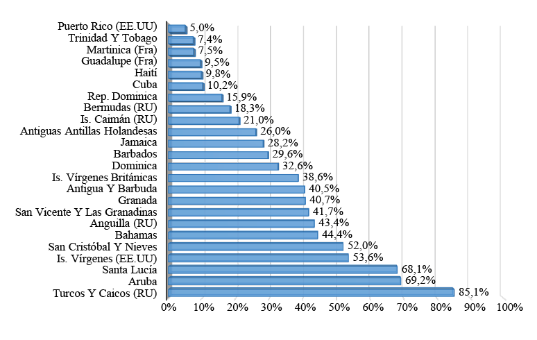 Por otro lado, en el año 2019, el turismo en la región alcanzó su máxima participación en la mayoría de las economías de las islas caribeñas. Según datos del Consejo Mundial de Viajes y Turismo (WTTC, 2020), en el último año antes de la irrupción de la pandemia, más de tres cuartas partes de los países del Caribe tenían una participación del turismo superior al 10,4% en el Producto Bruto Interno (PBI), lo que representa un valor por encima de la media mundial alcanzada en dicho año11. Incluso, según datos de las cuentas nacionales recabadas por la WTTC (2020), en 14 países y territorios isleños del Caribe se registran valores por encima del 25% (Fig. 3). Si le sumamos los dos territorios no medidos por la WTTC (2020)) y que se supone que también superan esos valores (las colonias francesas de San Bartolomé y Saint Martín), resulta que el turismo en más de la mitad (55%) de los 29 países y territorios de la región genera un cuarto del valor monetario total de la producción de bienes y servicios. Alcanzado este punto, los países y territorios configuran administraciones públicas centradas en la promoción de los destinos turísticos y en la atracción de inversiones sectoriales.