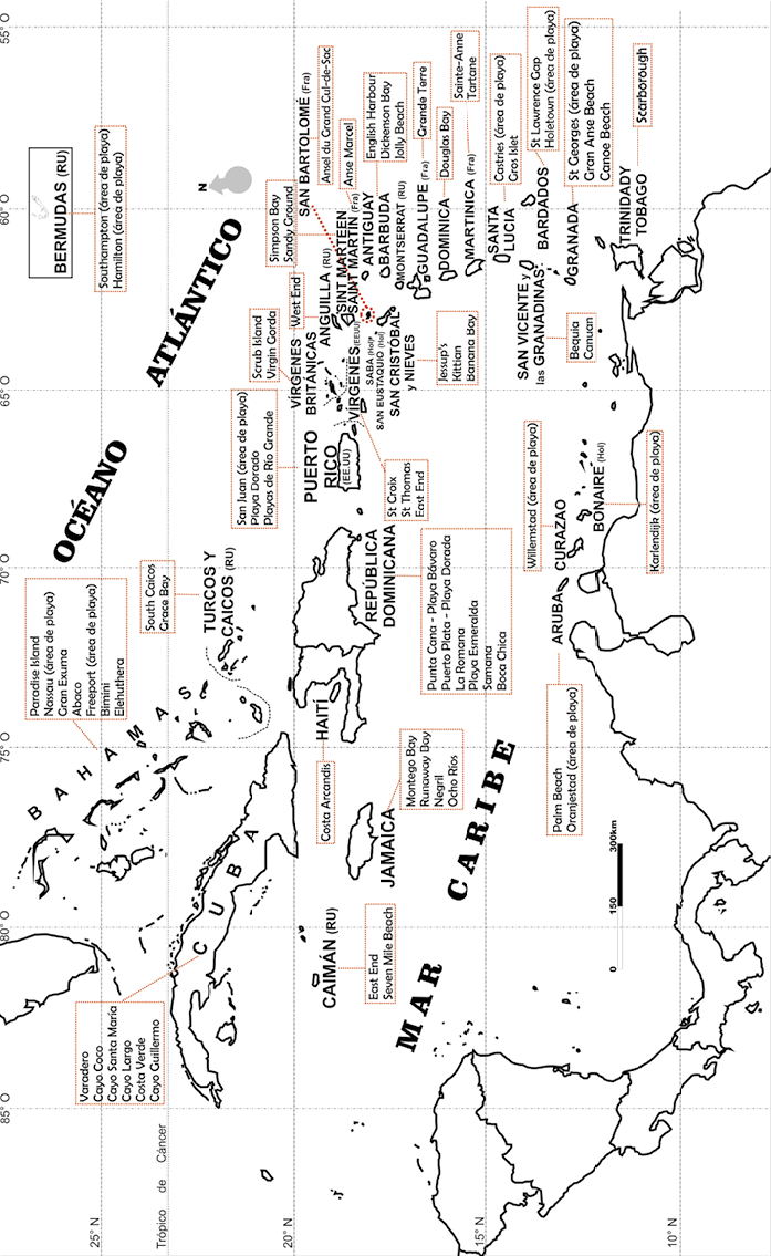 Las islas del Caribe, en una superficie de 251.700 km2 (apenas un poco más grande que el Reino Unido20), contienen 429 hoteles de las 43 firmas internacionales relevadas y ofertan 146.101 habitaciones capaces de alojar a 376.670 pasajeros21. Un segundo dato a destacar es aquel que evidencia la estrategia espacial de las cadenas hoteleras en la región para cumplir con los objetivos de su vida corporativa: de las 43 cadenas relevadas, todas tienen complejos en enclaves de playa. En las costas tropicales de la región, las corporaciones hoteleras relevadas han construido 132.132 habitaciones distribuidas en 356 resorts de playa que ocupan y fundan 71 diferentes enclaves de playa, correspondientes a 28 países y territorios de ultramar de los 31 que tiene la región Caribe. Las habitaciones en hoteles de playa representan el 90,4% del total relevado, dato que refleja la centralidad que tienen los litorales marítimos para la economía hotelera internacional que opera en la región.