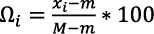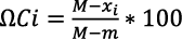 es el puntaje omega para la unidad espacial i, xi es cada uno de los datos individuales, m y M son el dato menor y el mayor de la serie de datos respectivamente. La comprobación para cada columna estandarizadas se produciría en cálculos que arrojen los siguientes valores: Min = 0 y Max = 100.
