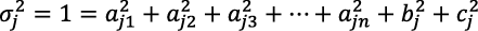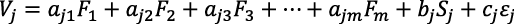 ) de cada variable individual como factores de error. Los coeficientes de cada variable en cada factor se denominan pesos factoriales o saturaciones. A partir de aquí, la segunda ecuación factorial presenta la varianza de Vjexplicada por la totalidad de los factores.