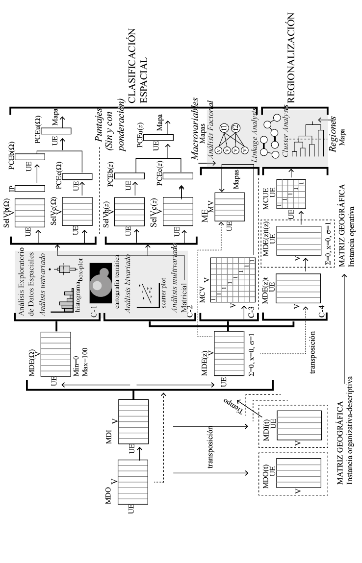 Cuando la MDE(z) se transpone y nuevamente se estandariza en el sentido de las unidades espaciales surge la matriz geográfica en instancia operativa como MDE(z)t(z). Ambas constituyen los insumos para la realización de las matrices de correlaciones y la posterior aplicación de las metodologías de análisis multivariado con el objetivo de unir variables en macrovariables o unidades espaciales en regiones respectivamente.