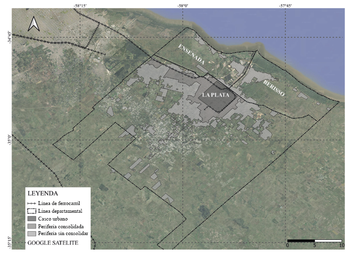La ciudad de La Plata, capital de la provincia de Buenos Aires, se encuentra a 49 km al sudeste de la Ciudad Autónoma de Buenos Aires. Fundada en 1882 como una ciudad planificada con un diseño ortogonal y espacios públicos, La Plata ha experimentado una evolución significativa durante las últimas cuatro décadas. Este proceso ha sido impulsado por el crecimiento demográfico y la creciente demanda de suelo urbano, un fenómeno que comparte con otras ciudades argentinas como Córdoba, Mendoza y Rosario (Cortizo et al., 2021). Estos factores han transformado a la ciudad, que pasó de ser una ciudad compacta y bien delimitada, a convertirse en una metrópoli fragmentada con límites territoriales en constante expansión. Actualmente, es el principal centro político, administrativo y educativo de la provincia de Buenos Aires, además de constituir el núcleo del Gran La Plata, un aglomerado urbano que incluye las áreas urbanas de los partidos de La Plata, Berisso y Ensenada (Fig. 1). Según el censo de 2022, la ciudad cuenta con 772.618 habitantes, mientras que el Gran La Plata alcanza una población de 938.287 habitantes.
