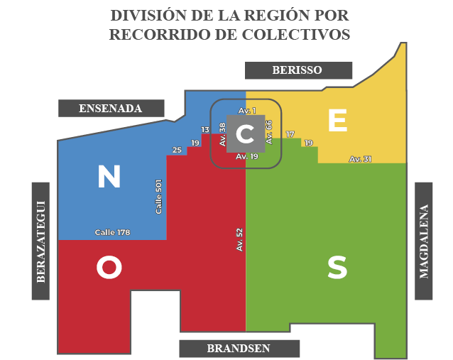 La ciudad se subdivide en cuatro áreas según las rutas de transporte: Norte (azul), Sur (rojo), Este (amarillo) y Oeste (verde) y Casco (gris).