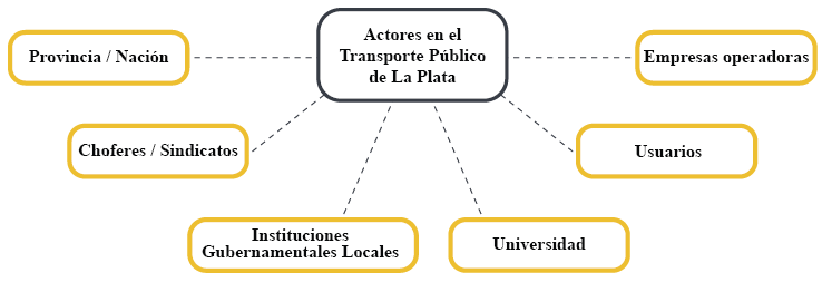El primer paso para construir el mapa de actores consiste en determinar quiénes intervienen en el sistema de transporte público de La Plata. Se distinguen seis actores principales, cada uno con lógicas e intereses distintos (Fig. 3):