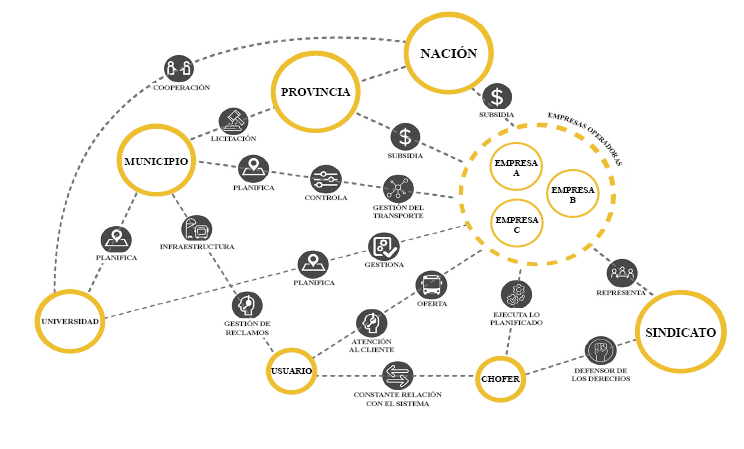 En este nivel de análisis resulta fundamental comprender la interacción entre los diversos actores que intervienen en su planificación, gestión y operación. Se representan sus intereses divergentes y las tensiones en la configuración de un sistema de transporte que impacta de manera desigual en el territorio y en la población.