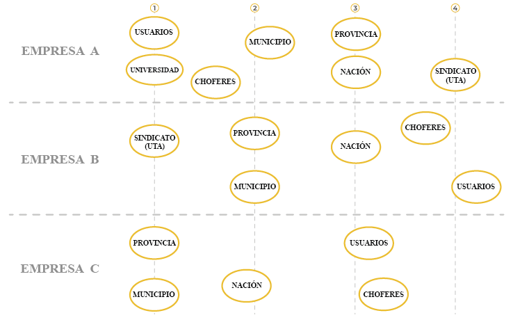 Por último, se encuentra el gremio; que como expresó la empresa A en la entrevista “en algunos temas puntuales ejercen por supuesto la representación de sus afiliados” (Comunicación personal, noviembre 2022). La Unión Tranviarios Automotor (UTA) tenía en ese momento permanente relación con los empresarios ya sea por motivos de negociaciones, beneficios o bien reclamos ante algún problema que afecten a los choferes. Lo mismo sucedía con el gobierno local, las negociaciones fueron permanentes y de manera directa.