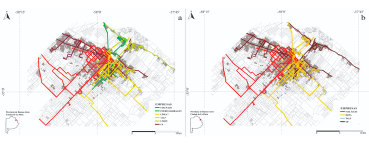 Por otro lado, y según la entrevista a la empresa A (...) “las líneas provinciales se copian de las líneas nacionales y entonces entran a la ciudad como líneas comunales, como líneas urbanas comunales” (...) (Comunicación personal, noviembre 2022). Al contrastar esta información con cartografías diseñadas por el OMUGLP, se evidenció que la empresa B comenzó a operar recorridos provinciales sobre líneas municipales superponiendo unidades y desequilibrando la competencia (Fig. 6 a y b). Si bien no se consiguió la respuesta de la empresa B, al sumar los recorridos municipales y los provinciales, esta empresa creció en los últimos 10 años de tal manera que llegó a ser la principal empresa del partido (Fig. 6).