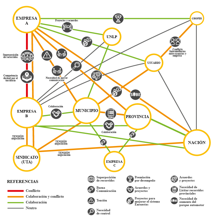 También, el mapa incluye a los usuarios y choferes. Los primeros, además de ser los principales beneficiarios, asumen un rol pasivo/ausente frente a las decisiones estructurales. Los segundos, se posicionan como intermediarios directos entre los usuarios y las empresas. Se encuentran organizados sindicalmente, lo que les permite luchar por la defensa de sus derechos laborales y las condiciones de trabajo.