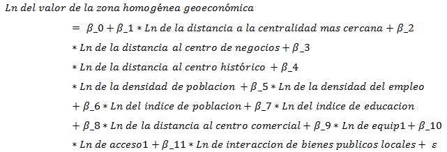Con el fin de derivar dichas demandas, es necesario colocar el precio del bien raíz en función de las características que conforman dicho bien, por lo cual la forma general del modelo utilizado es la siguiente: