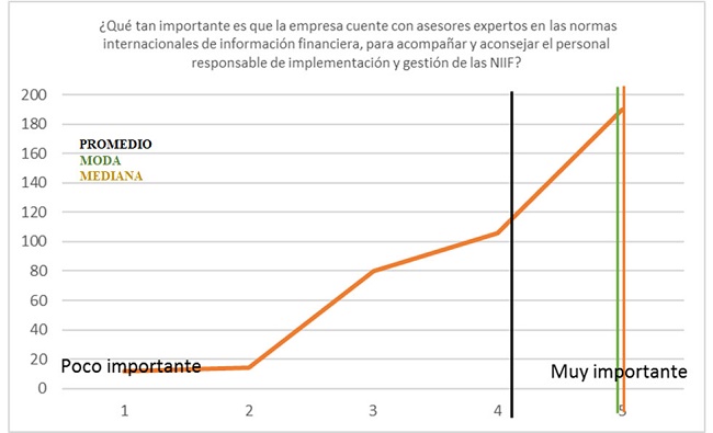 Un comportamiento similar al de la respuesta a la pregunta anterior, se vio en la reacción a la pregunta: “¿Qué tan importante es que la empresa cuente con asesores expertos en las normas internacionales de información financiera, para acompañar y aconsejar el personal responsable de implementación y gestión de las NIIF?”; la valoración promedio fue de 4,1 aunque sólo el 21% afirma y confiere una calificación entre 1 y 2.
