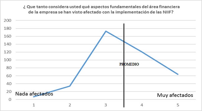 Con respecto a la pregunta: “¿Que tanto considera usted, que aspectos fundamentales del área financiera de la empresa, se han visto afectados con la implementación de las NIIF?”, en una escala entre 1 (Nada afectados) y 5 (Muy afectados); los encuestados valoraron con un promedio de 3,5, en la distribución se evidencia que la mayor concentración ocurrió en la calificación 3 con un 43% de los encuestados.