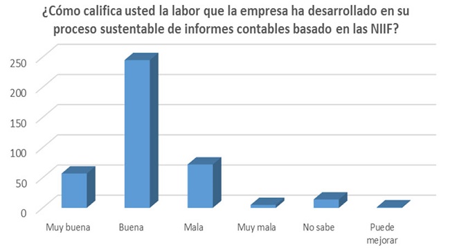 En este sentido, la calificación que se da a la labor que la empresa ha desarrollado en su proceso sustentable de informes contables basado en las NIIF, es en 62,2% buena, que contradice las tendencias anteriores en las que se afirma, con un porcentaje similar, que no hay implementación de las NIIF en las empresas y que existe desconocimiento de las normas. Esta contradicción puede deberse a la importancia de las NIIF que nota el encuestado a través del diligenciamiento de la encuesta.