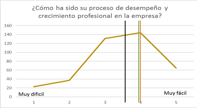 Estas categorías mediaron la búsqueda de la caracterización del proceso de implementación de las pymes, y por supuesto el diagnóstico o la intensión de medir el impacto. En esta etapa los encuestados califican, entre 1 (Muy difícil) y 5 (Muy fácil), su desempeño y proceso de crecimiento personal con una valoración promedio de 3,5; la gran mayoría valoró su crecimiento con 4, pero es de anotar que el 25% lo valoró con una calificación inferior a 3. Ver figura 4.
