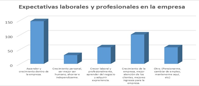 Las expectativas dentro de la empresa muestran el compromiso de al menos el 60% de los encuestados que se conciben con un ascenso y participando del crecimiento de esta. El 20% espera un crecimiento personal, independientemente de su situación con la empresa y sólo el 14% esperan la oportunidad para terminar su vinculación con la misma. Ver figura 5.