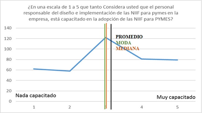 En esta búsqueda se les preguntó a los informantes: “¿Conoce las partes obligatorias de las Normas Internacionales de Información Financiera de implementación de las NIIF para pymes?”; “¿Conoce la Ley 1314 de 2009, los decretos que la reglamentan y las Circulares externas 115 y 200 de la Superintendencia de sociedades?” Y “¿Conoce usted el Cronograma de aplicación del marco técnico normativo para los preparadores de información financiera para las pymes?”. Se ratifica que hay una tendencia marcada hacia el desconocimiento de las NIIF en todos los aspectos señalados, con una tendencia marcada hacia el rechazo al cambio que puede producir su implementación. Por esto consideramos que la etapa de capacitación de las NIIF es considerada como fundamental. El nivel de capacitación que consideran los encuestados que tienen los encargados de la implementación de las NIIF en las empresas, se valora con un promedio de 3,1 en una escala entre 1 (Nada capacitados) y 5 (Muy capacitados); cabe resaltar que el 30% lo valora con una nota entre 1 y 2.