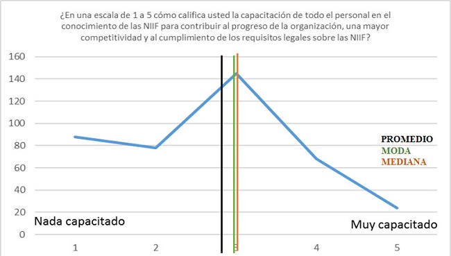 Con respecto al nivel de capacitación de todo el personal de la empresa en el conocimiento de las NIIF, los informantes valoraron con una calificación promedio de 2,7 en la misma escala de la pregunta anterior; subiendo hasta el 40% el porcentaje de encuestados que valoran entre 1 y 2, lo que resulta un nivel muy bajo de capacitación.