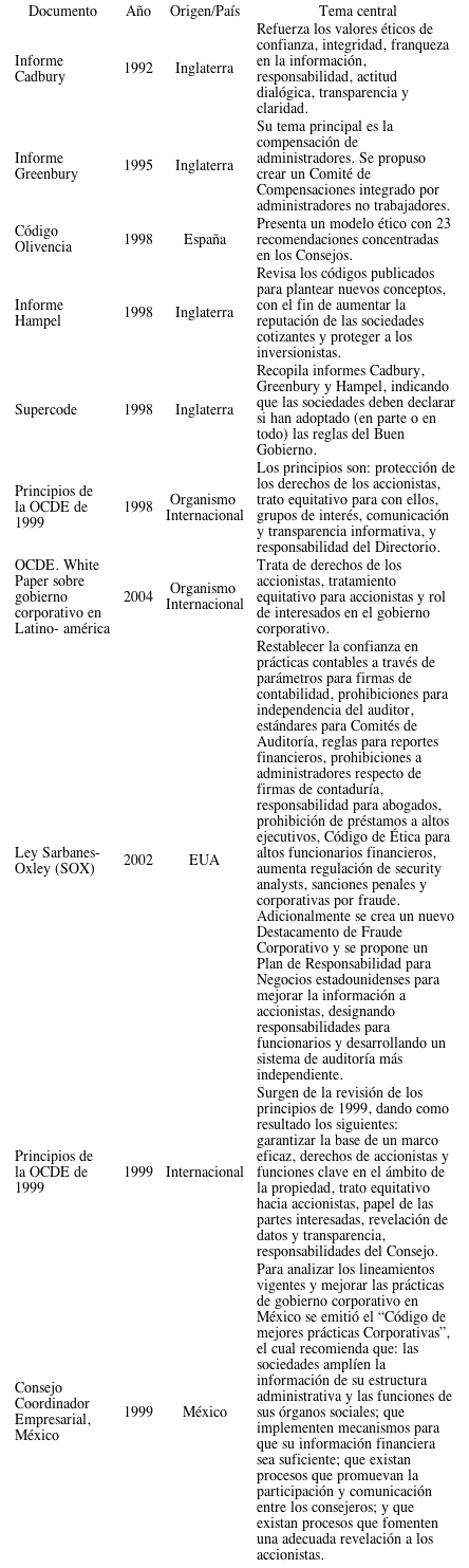 La tabla 1 presenta una relación cronológica sobre los principales acuerdos y consideraciones sobre gobierno corporativo, con el propósito de identificar los temas que en su momento se consideraron de mayor de relevancia.