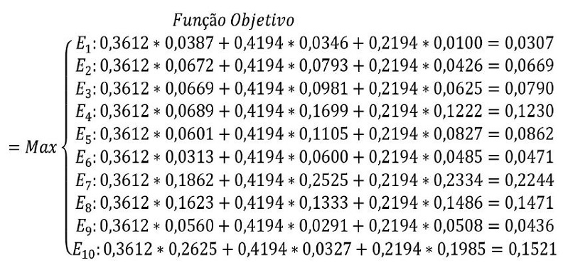 Os coeficientes de variação foram comparados entre si para assim obter os pesos. Cada elemento da coluna foi divido por cada elemento da linha, ou seja, , e assim, sucessivamente. Esses resultados podem ser verificados na tabela 5.