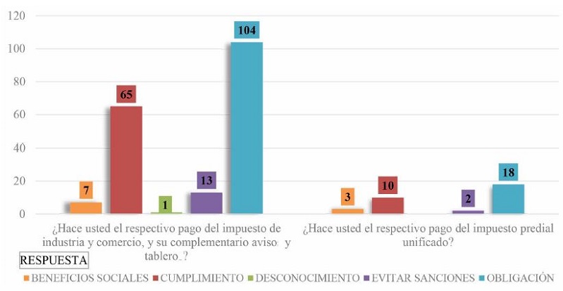 En cuanto a las razones por las cuales los contribuyentes realizan el pago de los impuestos, se identificó que el 37,9% en cuanto al impuesto de industria y comercio y el 39,4% con respecto al impuesto predial unificado, lo ejecutan para cumplir con la tributación y para obtener beneficios sociales, lo que manifiesta la relevancia que tiene para los comerciantes realizar el pago de la gabelas municipales para el sostenimiento y desarrollo de la región.