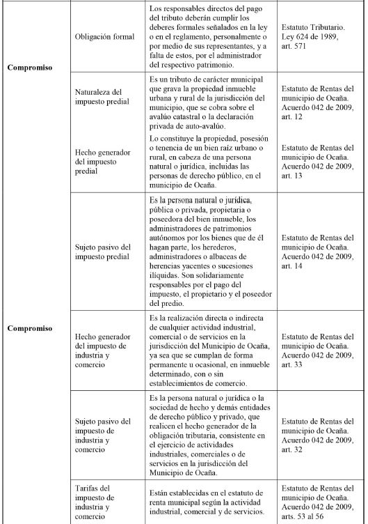 Para la determinación del nivel de cumplimiento en el pago de las obligaciones municipales, específicamente de los impuestos de industria y comercio, avisos y tablero y el predial unificado, se tuvo en cuenta la obligación tributaria formal y la obligación sustancial establecida en el Estatuto Tributario. Una de las características de la obligación tributaria sustancial es que nace de la ley cuando se realiza el hecho generador del impuesto y, por tanto, bajo un marco jurídico el sujeto activo, es decir, el municipio queda facultado para exigirle al contribuyente el pago de la obligación tributaria. Es así que la obligación sustancial crea en el sujeto pasivo la responsabilidad de tener conocimiento respecto al impuesto y de realizar el respectivo pago, es decir, ser consciente del compromiso adquirido y aceptar su obligación (Actualicese, 2017).