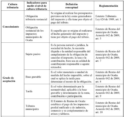 En la tabla 1 se identifican los indicadores para medir el nivel de cultura tributaria.