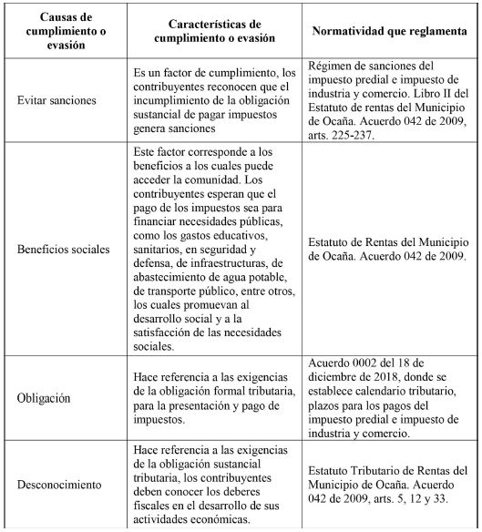 Con relación a lo anterior, en la tabla 2 se detallan las causales de cumplimiento o evasión en los impuestos. Es importante resaltar que junto a estas causales se debe considerar el nivel de cumplimiento para identificar la cultura tributaria de los comerciantes.