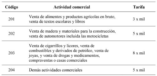 Con miras a conocer la población estudiada y describir sus características se procedió a categorizar las actividades económicas que desempeñan las empresas de la zona centro de la ciudad de Ocaña, obteniendo como resultado que las más frecuentes son las correspondientes a las prendas de vestir CIIU 4771, piñaterías-misceláneas CIIU 4769-4719, droguerías-perfumerías CIIU 4773, y calzado CIIU 4772, las cuales representan el 59% de las actividades que se realizan en el tejido empresarial estudiado, correspondiente al 28% prendas de vestir, 13% piñaterías y misceláneas, 11% droguerías y perfumerías y el 7% calzado, respectivamente. Por tanto, las empresas que ejercen estas actividades tienen gran importancia en el comercio de Ocaña, y están sujetas a una de las tarifas del impuesto de industria y comercio, avisos y tableros más altas aplicadas al sector comercial en la ciudad. La información se puede apreciar en la tabla 3.