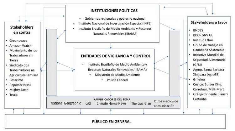 Adicionalmente, dado que la operación de JBS en Brasil se da en un escenario con múltiples actores –sociedad civil, entidades del gobierno, participantes de otros países y la naturaleza– y con multiplicidad de interacciones y conflictos, usamos el concepto de “arena” en el caso JBS como una guía para entender el problema de la insostenibilidad de sus acciones, ver la figura 1(Contrafatto et al., 2015; Georgakopulos & Thomson, 2008; Renn, 1992; Thomson et al., 2010).