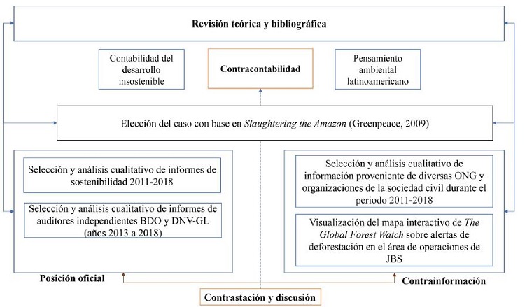 En este caso, para construir la contracuenta partimos del informe emitido por Greenpeace en 2009 denominado Slaughtering the Amazon, haciendo un análisis de los argumentos esgrimidos por la ONG y los contrastamos con la información oficial contenida en los reportes de sostenibilidad de JBS S.A. desde 2011 (primer informe según Global Reporting Initiative - GRI) y en los informes de sus dos auditores independientes –BDO y DNV GL– desde 2013 a 2018. Con ello, encontramos los argumentos centrales de la posición oficial y los controvertimos, construyendo un relato alternativo desde los grupos de interés. Una síntesis del diseño metodológico se puede observar en la figura 2.