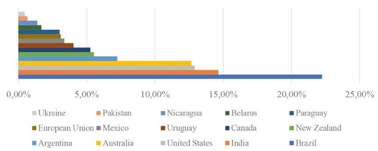 USDA (2020). Meat, Beef and Veal %World Exports. Recuperado el 28 de enero de 2020 de https://apps.fas.usda.gov/psdonline/app/index.html#/app/topCountriesByCommodity