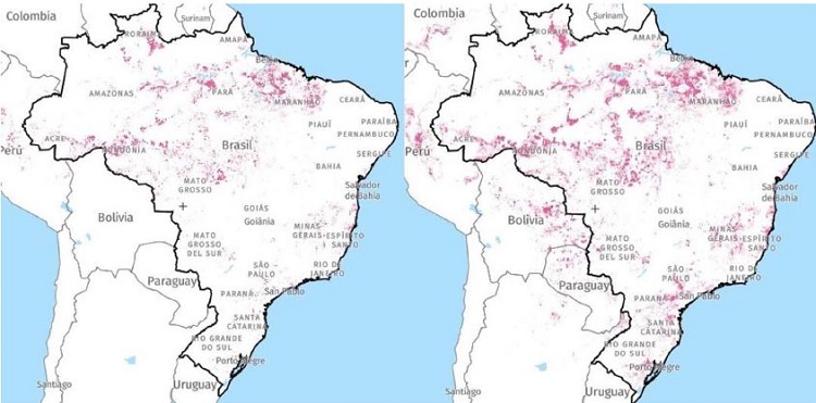 La figura 4 muestra el aumento en las alertas de deforestación en Brasil entre 2015 y 2019. El primer recuadro muestra las alertas a diciembre de 2017 y el segundo recuadro muestra las alertas a diciembre de 2019.