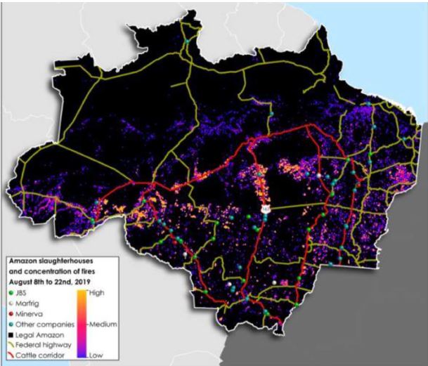 En 2019 Mighty Earth publicó un informe titulado The Companies Behind the Burning of the Amazon en el que sugirió que la ganadería a gran escala representó un incentivo perverso para los incendios de la Amazonía brasileña. Sus análisis evidenciaron que los mataderos de JBS se encontraban muy cerca de los incendios en la Amazonía, como se observa en la figura 5, lo que muestra que después de diez años JBS sigue siendo uno de los responsables por la deforestación en el Brasil. Esto contradice de manera clara el discurso oficial de la empresa que alude constantemente a su compromiso ético y ambiental.