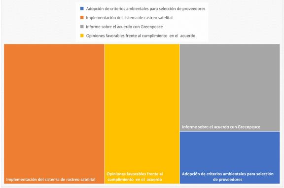 La figura 6 muestra los temas de mayor relevancia en los discursos oficiales de JBS y de sus auditores, en relación con sus implicaciones en la deforestación de la amazonía brasileña. Dentro de estos, la información oficial resalta la implementación del sistema de rastreo satelital para monitorear a los proveedores. Vale la pena aclarar que en este caso es evidente que el discurso omite que dicho sistema se enfoca en la vigilancia de proveedores directos. En segundo lugar, se encuentra la recurrencia de opiniones favorables por parte de los auditores contratados por JBS en relación con el cumplimiento de los acuerdos. Estas opiniones quedan seriamente cuestionadas por la contrainformación recolectada. No obstante, en todos los informes analizados los auditores aclaran que la verificación fue realizada apenas a una muestra no mayor al 15% de las transacciones de JBS.
