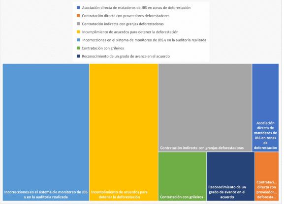 De acuerdo con información de Climate Home News (2017), el ganado de granjas embargadas había sido transportado a otros lugares para ocultar su origen, con lo que quedó expuesto que el sistema de monitoreo implementado rastreaba las propiedades pero no las reses individualmente consideradas (Fearnside, 2017), y que JBS no ejercía ningún tipo de control o auditoría sobre los proveedores indirectos, haciendo invisible parte de la cadena de suministro (The Guardian, 2019). Más recientemente, Amazon Watch publicó un informe en el que evidenció que la Agropecuária Santa Barbara Xinguara (AgroSB) y la Agropecuária Rio da Areia LTDA, multadas en 2017 y 2018 por deforestación ilegal eran dos de los principales proveedores de ganado a JBS (Amazon Watch, 2019).