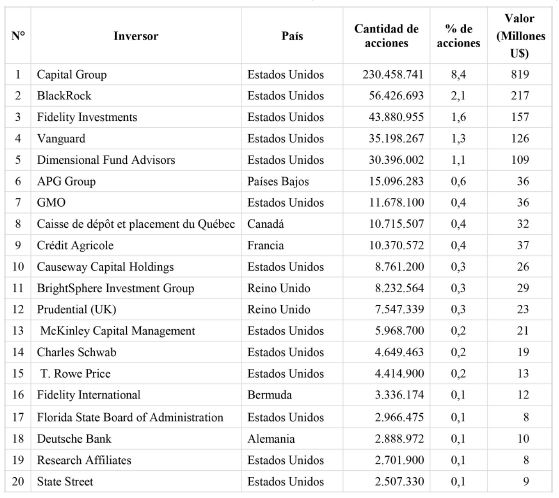 En el año 2007 JBS ingresó a la Bolsa de Valores de São Paulo y en los años siguientes realizó importantes adquisiciones en Estados Unidos, Australia y Argentina. Actualmente la compañía cuenta con oficinas y plantas en cinco continentes y abarca tres segmentos de negocio: carne de res, pollo, cerdo y diversos subproductos. Opera las marcas Pride, Friboi, Seara , Pilgrim’s y Plumrose, entre otras (JBS S.A., 2019a; Reuters, 2020). De acuerdo con su informe de sostenibilidad de 2018 el 40,64% de JBS es controlado por J&F Investimentos S&A e Formosa; el 21,32% es propiedad de BNDES Participações S.A. y el 35,6% es propiedad de accionistas minoritarios (JBS S.A., 2019a). En 2019, Amazon Watch reveló los principales accionistas institucionales europeos y norteamericanos de JBS, como se observa en la tabla 1.