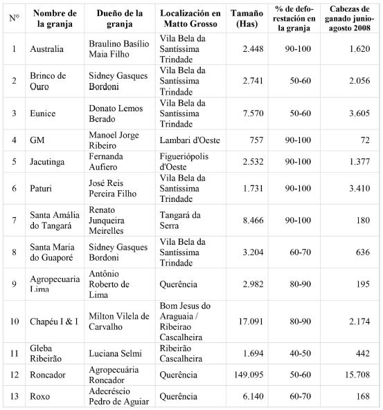 La tabla 2 muestra los datos de las granjas identificadas por Greenpeace en Matto Grosso que se encontraban deforestadas y que proveían a JBS en 2008. Esta información no se encuentra en ninguno de los informes de sostenibilidad de la empresa, ni se relaciona en algún informe de sus auditores.