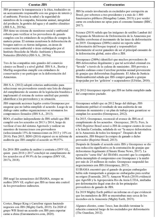 Teniendo en cuenta lo anterior, una síntesis de las cuentas oficiales de JBS y las contracuentas presentadas por actores de la sociedad civil se observa en la tabla 3.