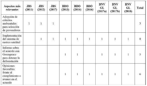En 2015 Greenpeace reconoció el avance de JBS en el cumplimiento de los acuerdos, lo que coincidió con el informe de auditoría emitido por BDO que señaló que, con base en una muestra de 10% de las transacciones, se cumplió en un 99,97% con el acuerdo firmado (BDO, 2016; Greenpeace, 2015). En el mismo año la ONG Repórter Brasil acusó a JBS de comprar cientos de reses a la familia Castanha, señalada por la Policía Federal de ser “la mayor deforestadora de la Amazonía de todos los tiempos”. Después de tal acusación, JBS bloqueó la compra de ganado a dicho proveedor (Repórter Brasil, 2015).