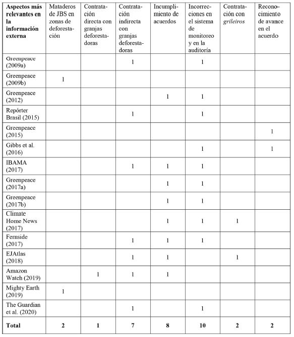 El análisis de los documentos seleccionados nos permitió generar un sumario de los temas más relevantes que se encuentran en el discurso oficial de JBS versus los que se encuentran en las fuentes externas. Dicho resumen se presenta en las figuras 6 y 7, en las cuales se vislumbra claramente que el discurso contable oficial de JBS invisibiliza su responsabilidad y omite gran parte de los hechos. Adicionalmente, en las tablas A1 y A2 del anexo detallamos la distribución de temas relevantes por actor involucrado en la situación conflictiva.