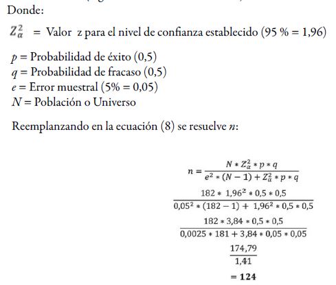Dado que la población es conocida y pequeña se obtuvo la muestra utilizando la fórmula de las poblaciones finitas o conocidas ( Aguilar, 2005; Fuentelsaz, 2004).