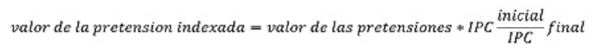 Valor del monto económico: “corresponde al valor monetario del proceso, procesos o la pretensión del demandante con la correspondiente indexación del valor económico de acuerdo con el índice de precios al consumidor (IPC)” ( MHCP, 2011, p. 44). El artículo 5 de la Resolución 353 de 2016 de la Agencia Nacional de la Defensa Jurídica del Estado identifica la ecuación ( 1) para el cálculo de la pretensión indexada: