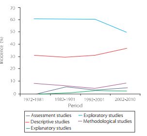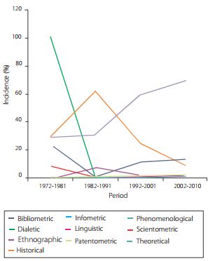 It should be noted that there is no occurrence of field studies between 1972 and 1981, as during this period authors preferred an epistemological approach due to the historical moment both in politics and science, when the exercise of criticism to reality was restricted by political influence. This historical moment was marked by positivist studies that aimed at solving operational problems. Consequently, studies focused on the production of quantitative data, not always contextualized data, as in the case of bibliometric studies.