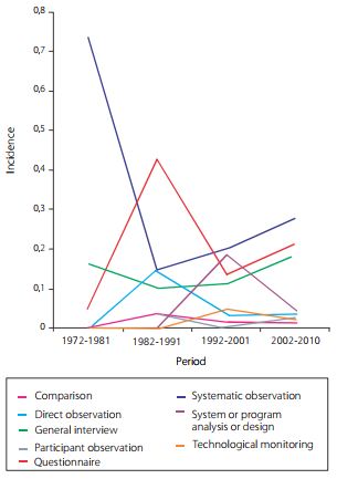 The interview (28) ranks third place, representing 15.65% of the corpus. Its incidence is always less when compared to questionnaires, although its use has been increasing in field research and case studies. From 1992 to 2001 the use of questionnaires decreased and interviews became more predominant. System or program analysis or design (7) are most commonly used for creating and/or validating methods and/or types of analysis for real situations.