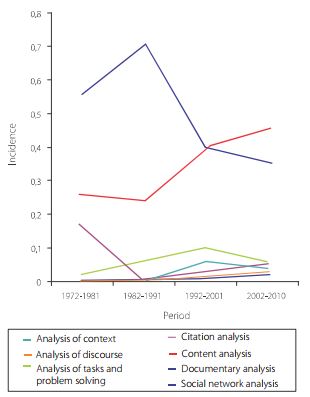 Citation analysis, used in 4% of the corpus, is significant from 1972 to 1981. At that time, a large number of descriptive and documentary studies, characterized as citation analysis studies, were conducted. This type of analysis is common in studies on author productivity and analysis of formal sources, such as scientific journals. The type of analysis called task and problem solving (7%) are evident from 1992 to 2001, as a characteristic analysis of management and operational studies. Social network analysis begins to be used as a type of study only as of the 1990s due to the popularity of social networking for studies on behavior, organizational environments, access and use of information.