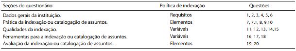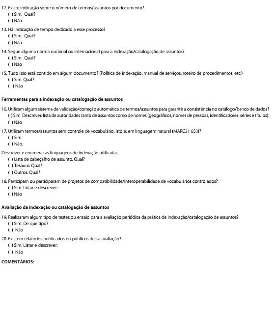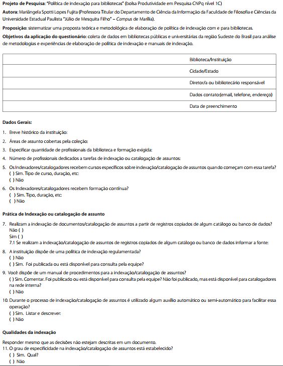O questionário, elaborado por Fujita (2010) para coleta de dados, tem por objetivo "verificar se os pro-fissionais fazem indexação e se adotam uma política de indexação e manual de indexação com base nos estudos teóricos e metodológicos sobre indexação, política de indexação e experiências de elaboração de política de indexação e manuais de indexação" (Fujita, 2010, p.31).