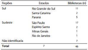 Foram obtidos 46 questionários respondidos den-tre os 102 enviados, sendo 18 de bibliotecas da região Sul do Brasil e 21 da Sudeste. Em 7 deles, não constava a identificação da biblioteca, o que inviabilizou a identi-ficação do estado e, por isso, foram desprezados na análise (Quadro 2).