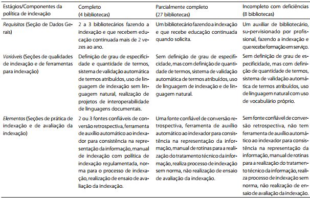A averiguação de requisitos, variáveis e elementos da política de indexação confirmou que estes compo-nentes da política estão presentes nas bibliotecas, como demonstram os resultados do estudo diagnóstico. A deter-minação de estágios de formalização da política de indexação - completo, parcialmente completo e incompleto com deficiências -, realizada a partir dos resul-tados da tabulação e análise dos dados dos questionários respondidos, identificou a seguinte situação (Quadro 3).