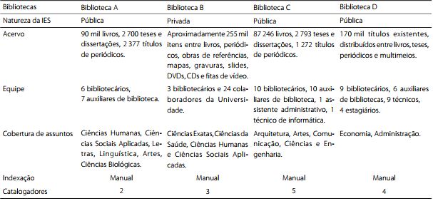 As bibliotecas, denominadas nesta pesquisa de Bibliotecas A, B, C e D, estão localizadas no estado de São Paulo; uma delas situa-se na capital e três no interior. Da mesma maneira, três das instituições selecionadas com-põem Instituições de Ensino Superior (IES) de caráter público e uma, privado.